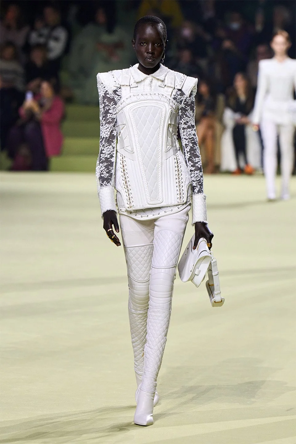 轻盈细腻的触感与安全和力量的象征相结合,这种充满反差的独特组合,反映了Olivier Rousteing最近的人生感悟:如果我们都能怀揣个人的诚实、集体的同理心与共同进步的希望,在那些污浊的纷扰面前,我们便不会束手无策。