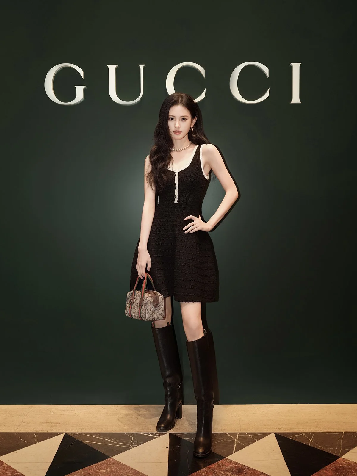 演员沈羽洁身着古驰黑色格纹花呢针织连衣裙,搭配饰有银色马衔扣细节的黑色厚底中跟皮靴、浅金色珍珠颈链与Gucci Blondie系列交锁水晶耳环、Gucci GG迷你手袋亮相于古驰西安SKP女装精品店举办的GG Monogram活动。