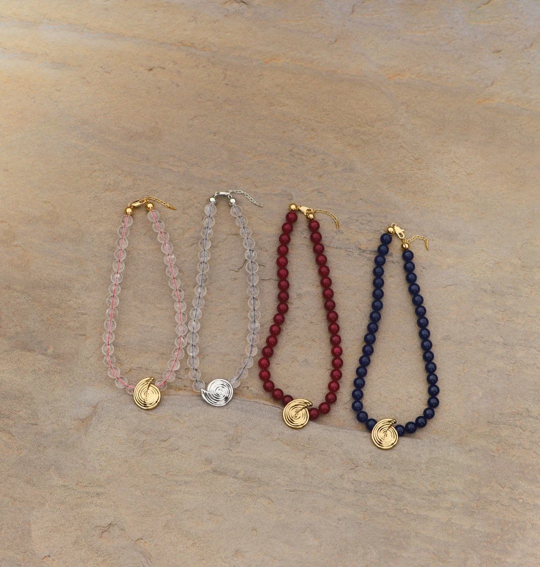 石榴红天然水晶串珠海螺吊坠项链大胆亮眼,将红色水晶与精致海螺吊坠串联,释放夏日的热情与活力;暮色蓝天然水晶串珠海螺吊坠项链则更显摩登中性,宛如辽阔静谧的暮色海面,令人心神宁静。红色皮绳与蓝色皮绳透明天然白水晶串珠海螺吊坠项链采用天然白水晶精磨而成,搭配金银双色海螺吊坠与彩色绳结,在阳光下折射纯净光泽,传递灵动而温润的积极能量。