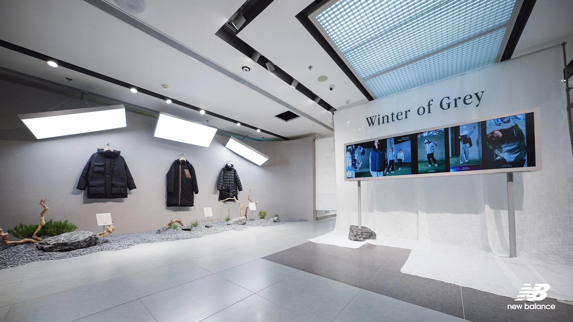 在“Winter of Grey”主题活动中,New Balance运用自然、光与影的布景元素,糅合三种不同的全新NB GREY冬季服饰系列的创作主题背景,制造出极简禅意的室内氛围,诉说着品牌独特的冬日美学。
